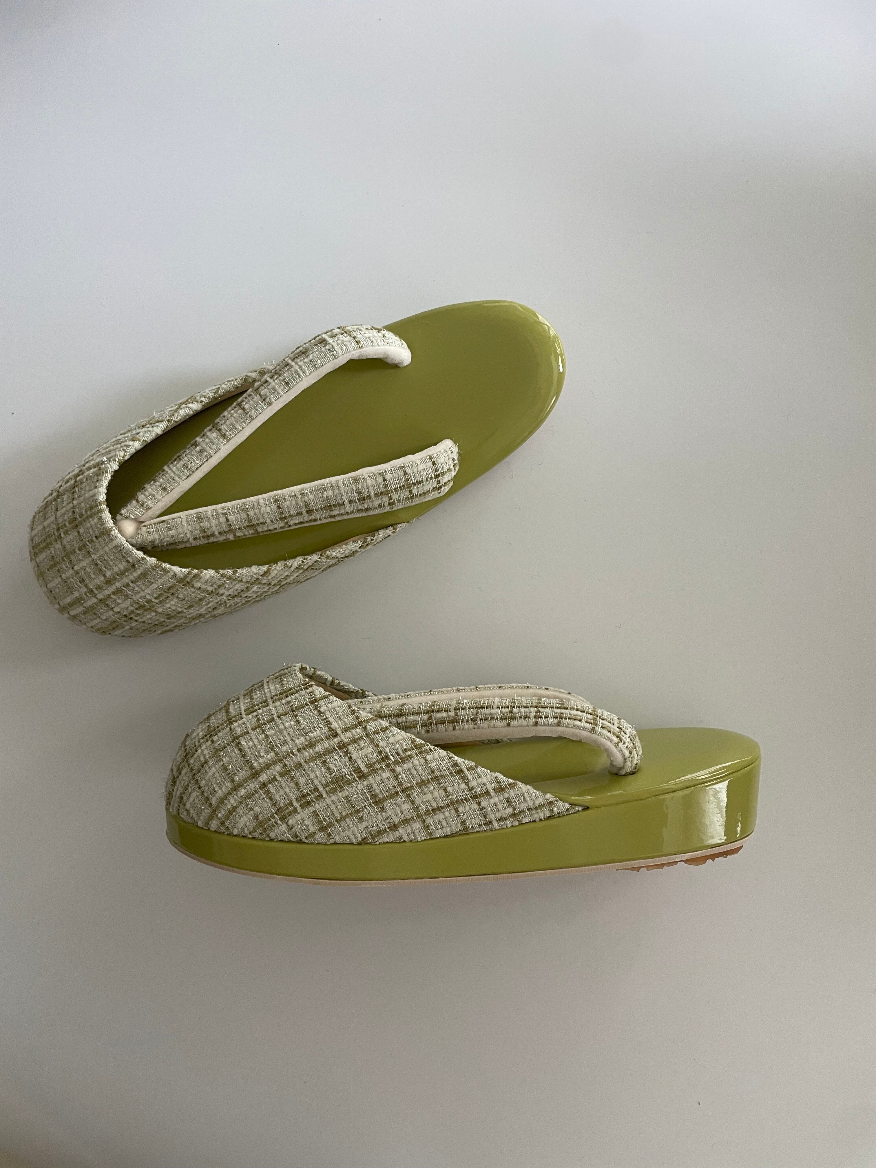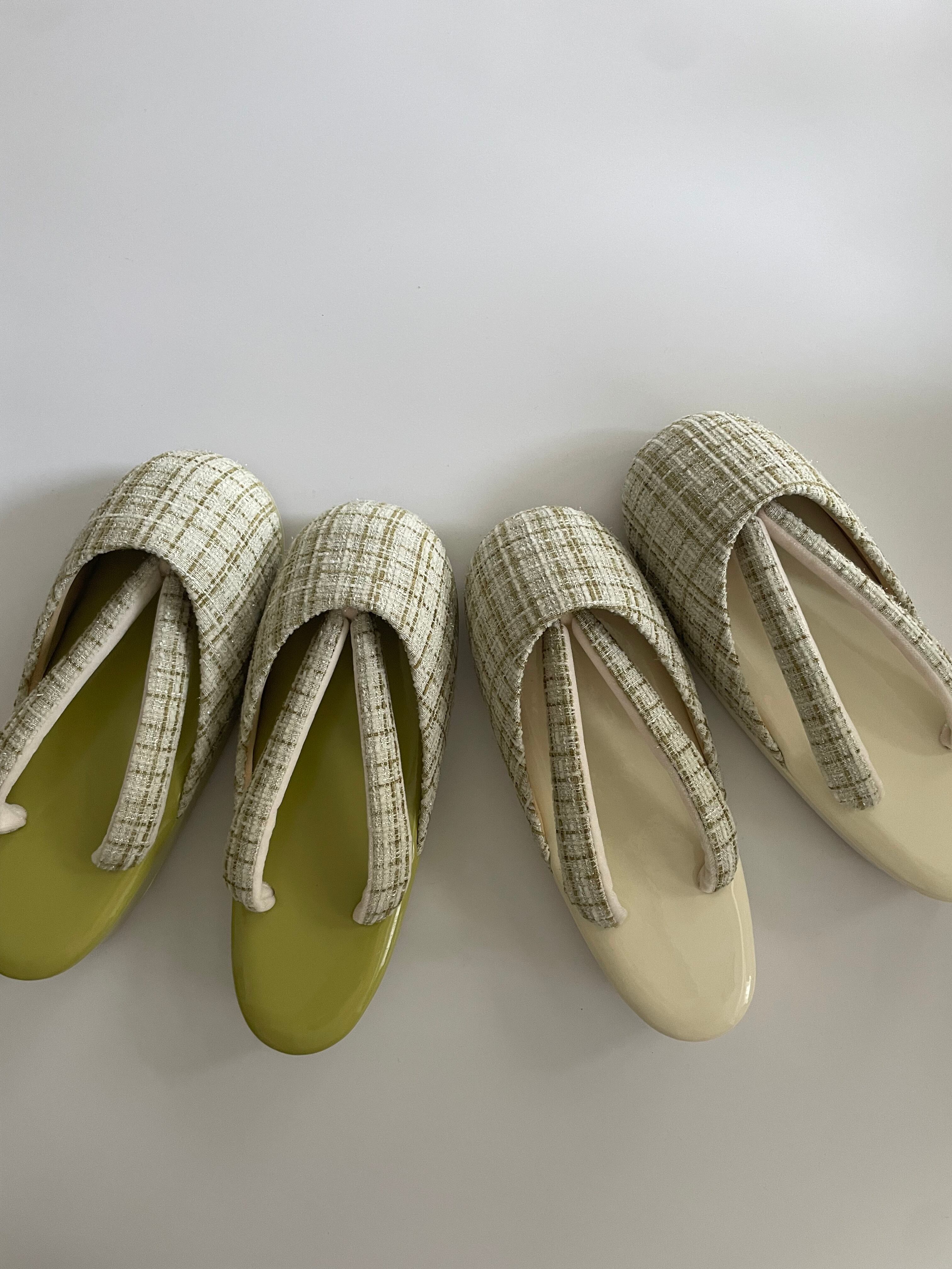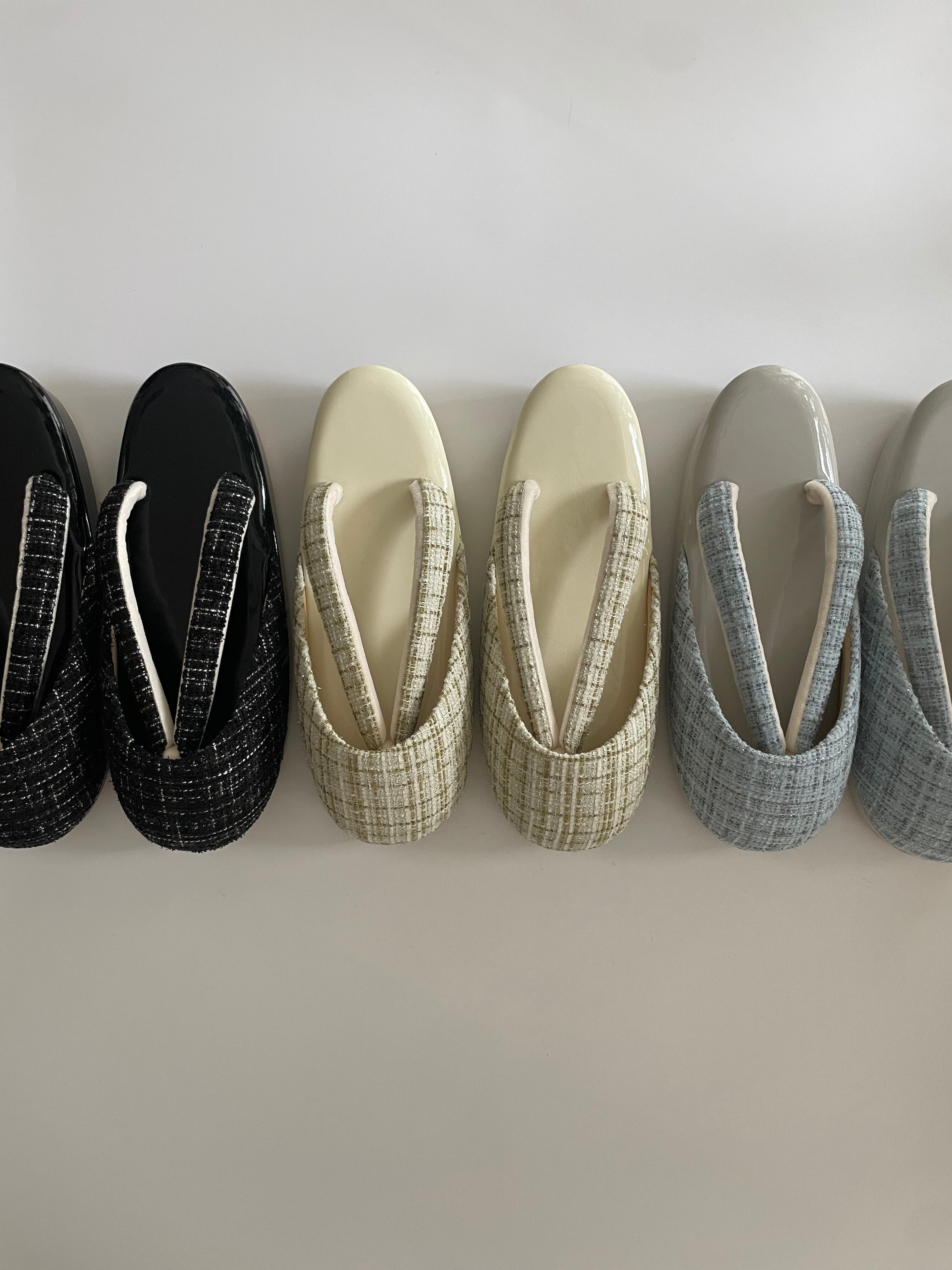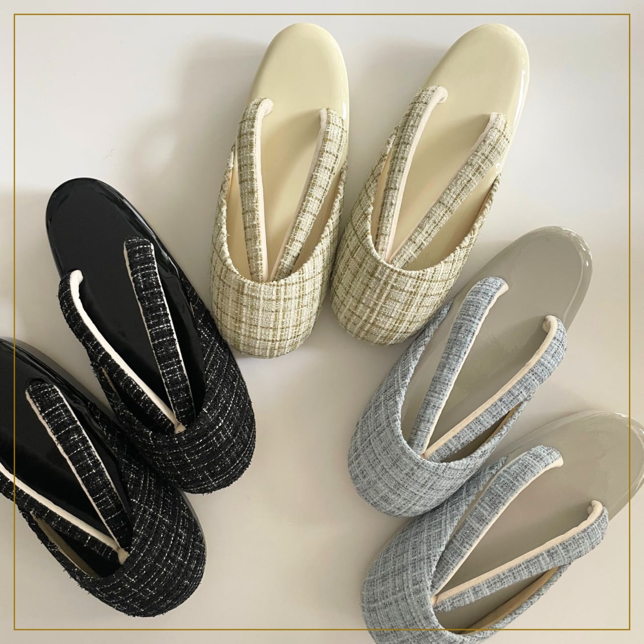 「ファンシーラメツイード」シリーズは、繊細なラメ糸が織り込まれているツイード生地をカバーと鼻緒に取り入れ、