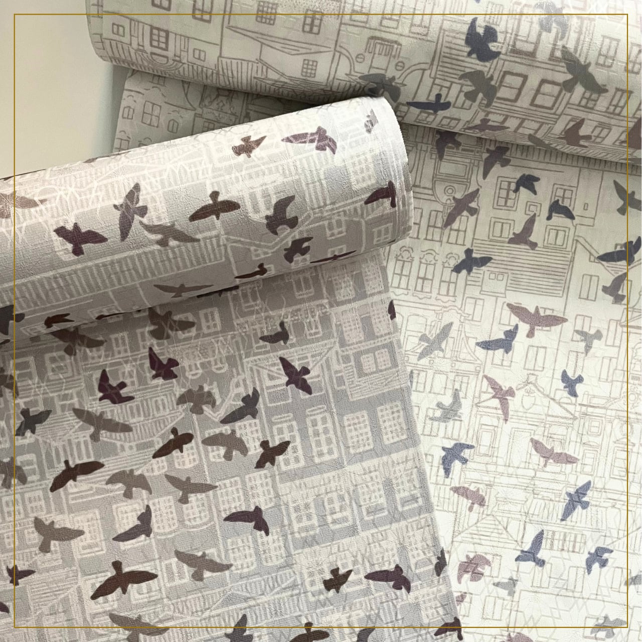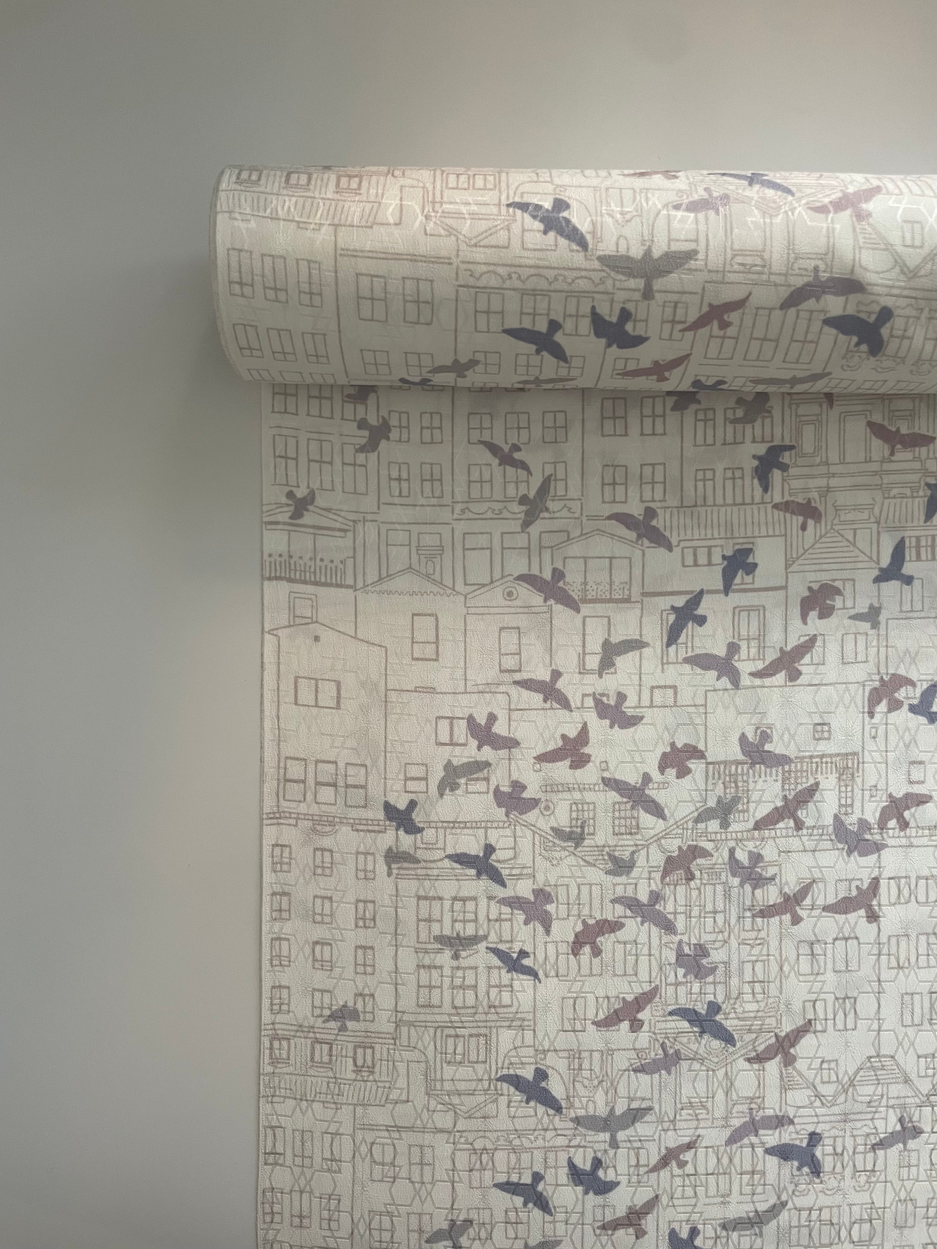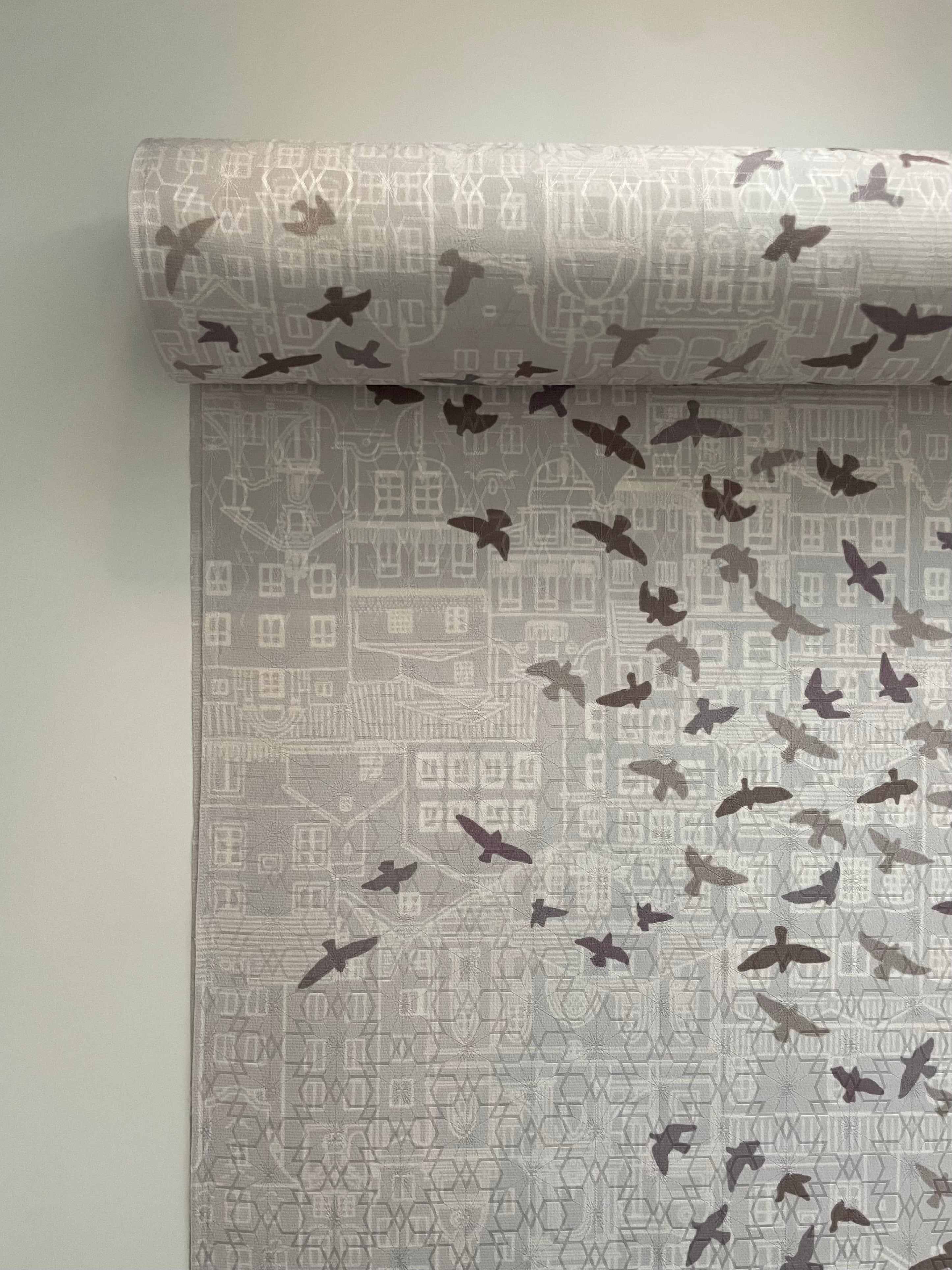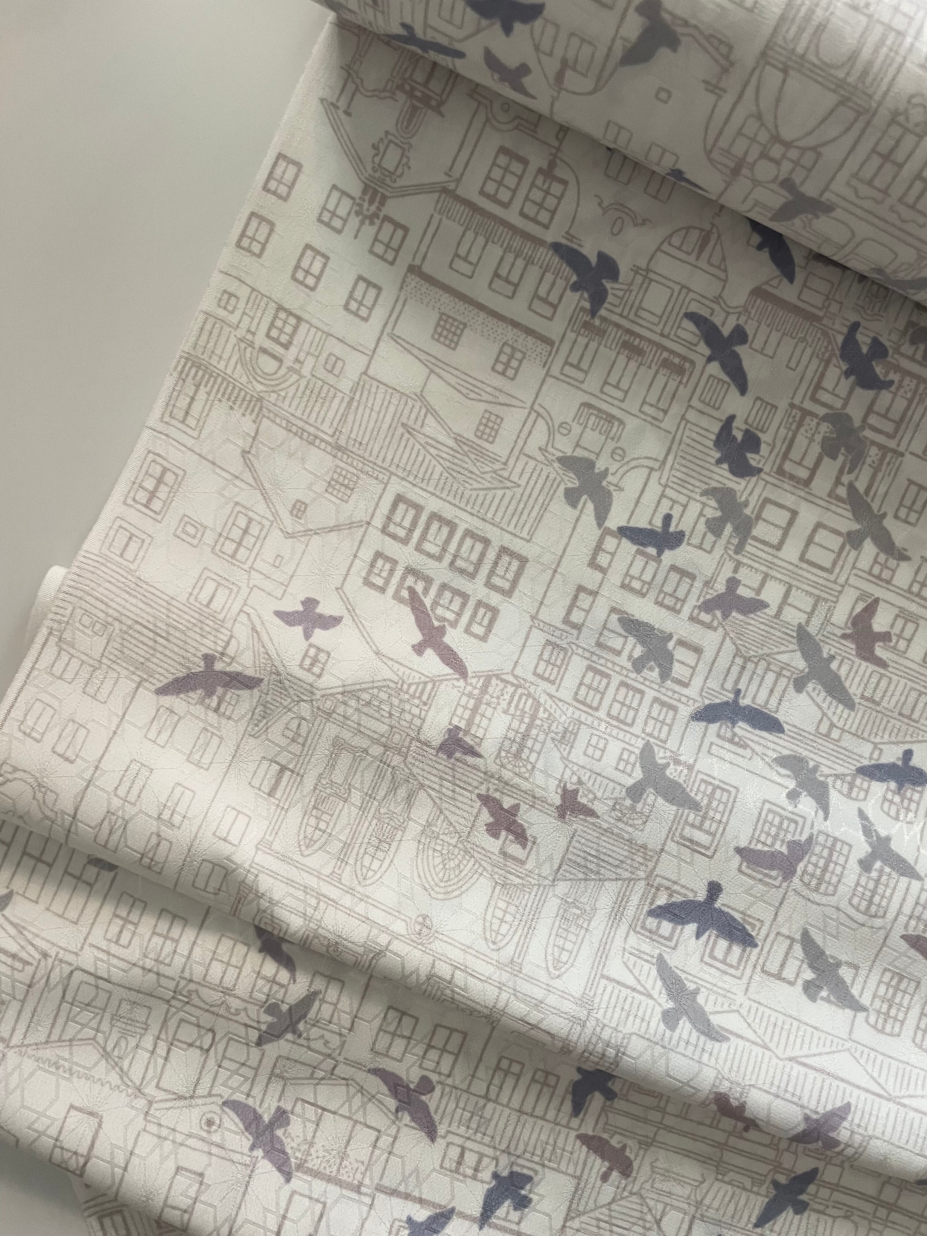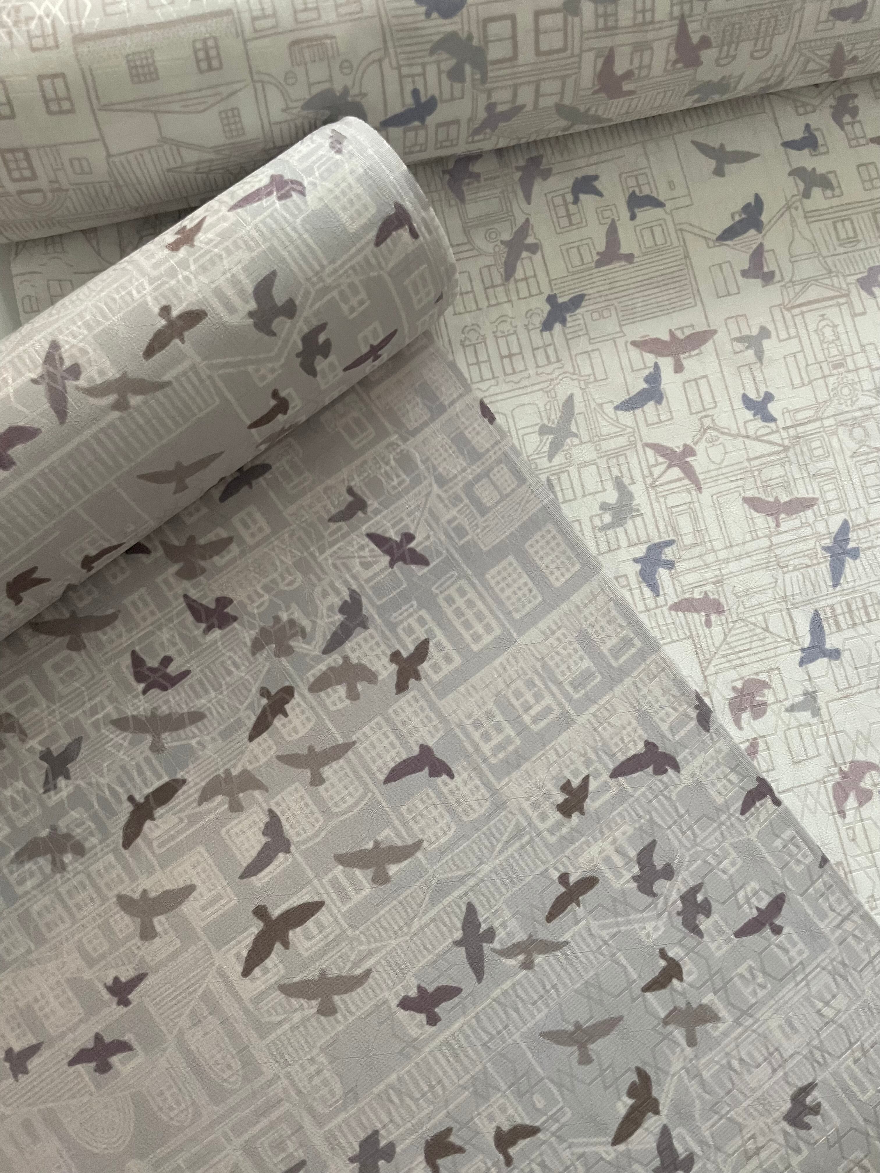 異国の街並みを背景に、鳥たちがのびのびと空を舞っています