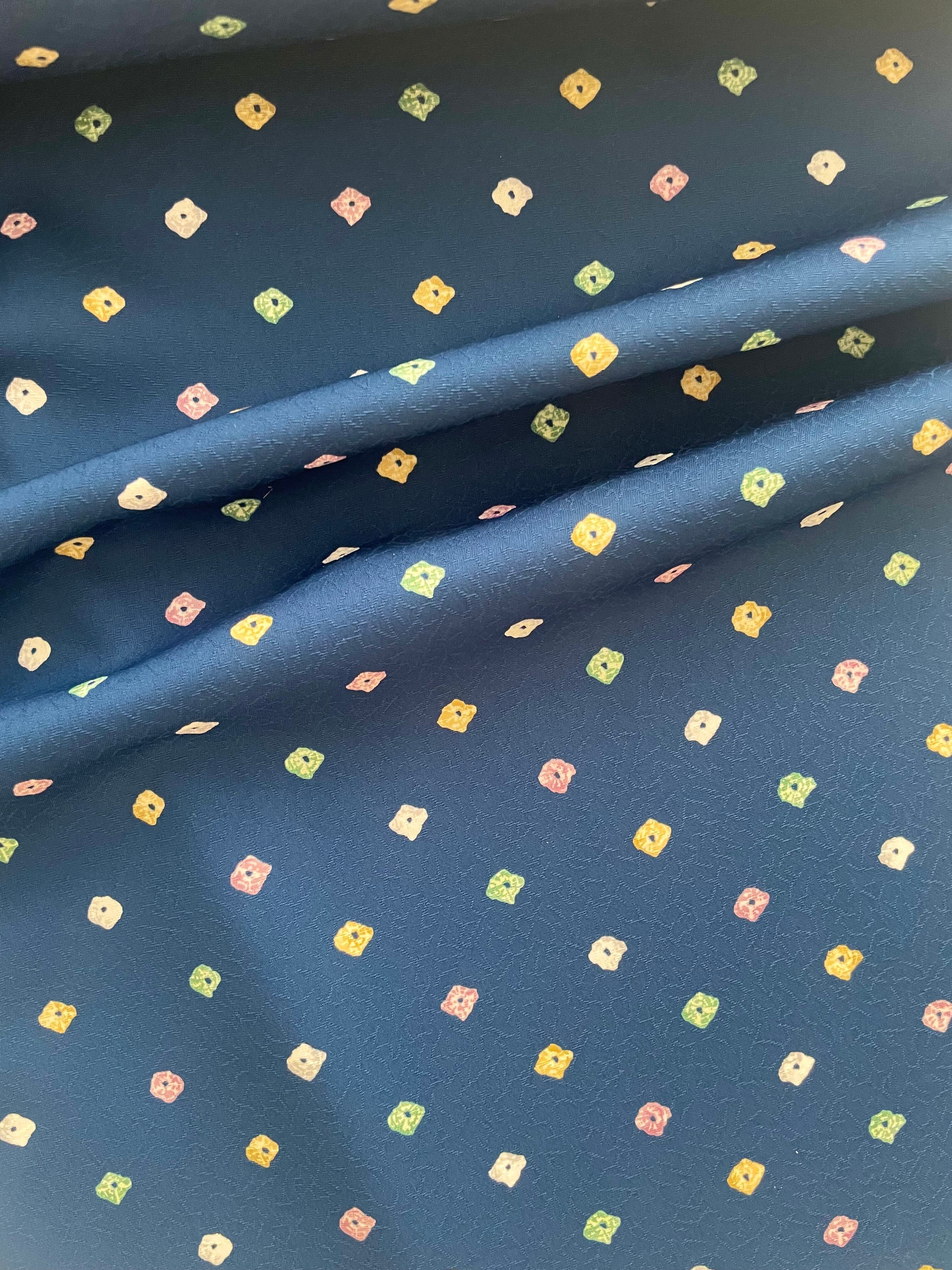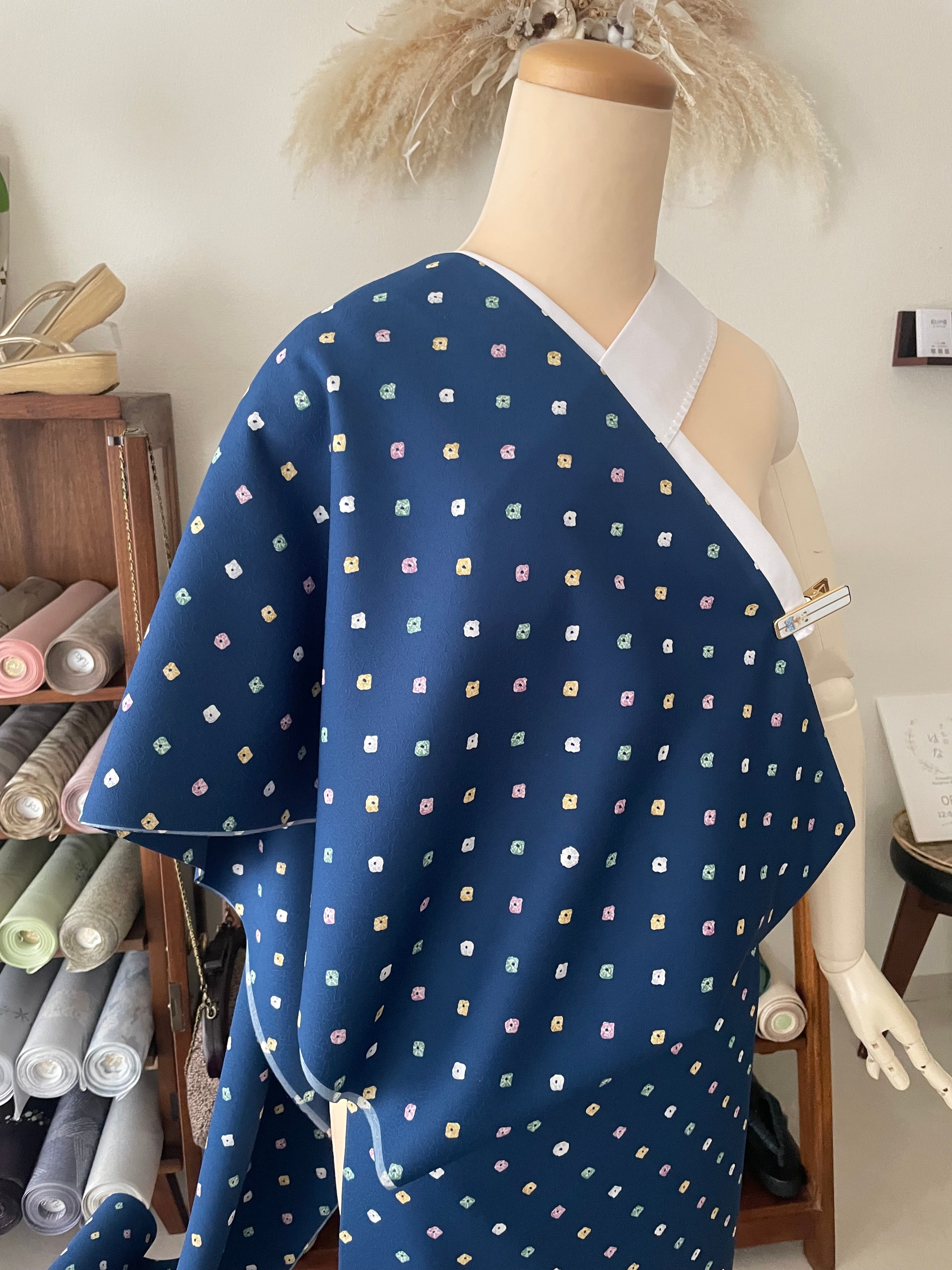 深みのあるインクブルーに、カラフルなドットがPOPで楽しい小紋です。